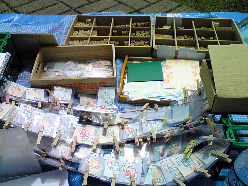 さて、到着直後は雲が多めの天気だったのですが、徐々に雲が取れてとても良い天気に…でも、その代わりすごく風が強い!(最初地形特有の状況なのかと思ったのですが、県内全般強かったようですね)シートを敷くだけで一苦労です^^; 軽くて高さのあるものはハンガーラックやタープテントですら飛ばされていたので、ポストカードなどを掲示しようと思ったワイヤーラックや日よけ用パラソルはことごとくシート用重しに…(という状況でメールを作ったのでした)