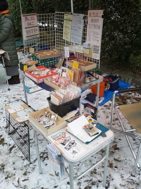 今回は、こぎん刺しの「engawa」さんと共同出店だったのですが、座っている端から雪が…積もってくるんです。