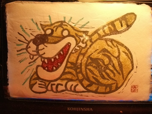 今回はミニミニ木版画本やポストカードなどを出展されていたので、「連れて帰ってー☆」と言っていた(と私が受信した)虎さんのポストカードを購入しました。手漉き和紙のはがき紙に多色刷りの一品です。