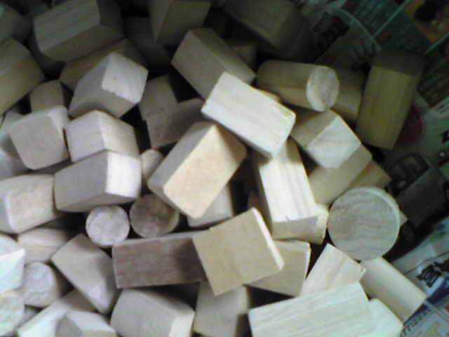 丸棒・角棒については、杉材だったり桂材だったり、その時によりけりですが、13~15mm径(角)のものを2~2.5cm程度の長さにカットしていきます。こちらは木目があるので(場合によっては小さい節の混ざる場合もあります)、切りづらいところを避けてカットすることもしばしば・・・