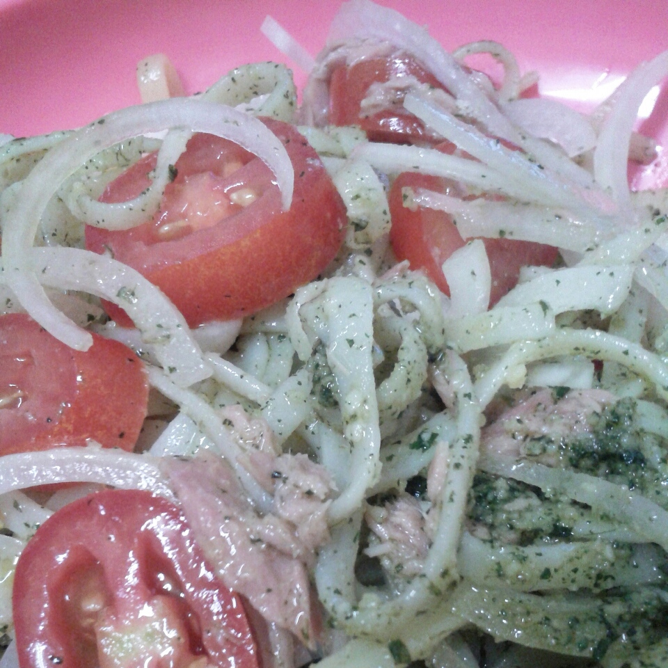 昨日の試食会の後におすそ分けいただいた「しそジェノベーゼソース」で冷製パスタなど。