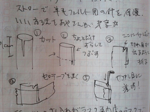 ここでは羊毛フェルト用の羊毛やフェルト針も販売しているのですが、フェルト針はストローで保護するんです。先端だけでなく、羊毛を絡ませるための返しが付いてるので危ないんですよ…