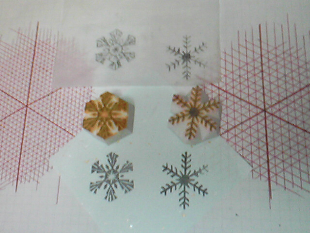 この写真のような下敷きを作って(定期的に更新しながら)雪の結晶や花モチーフなどのデザインの手助けにしています。 左は3mm、右は5mm目盛りで方眼にしています。 …って三角形だから方眼じゃないか… (「方」は「正方形」の意味があります)ともあれ、これらを下敷きにしてトレーシングペーパーに鉛筆などで直接下絵を作っていきます。 左みたいなちょっとベタ多めの、初めてデザインしたな…案外いい感じなんで似た系統ちょっと連作してみよう♪