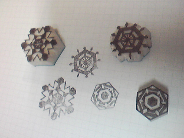 年明けの後はずっと雪の結晶はんこを彫り続けているような気がします(笑) というのも、イベント売り用だけでなく、委託販売用にお願いするぶんや、紙雑貨やワークショップ用にキープしておきたい柄のぶんなども作っておきたいからです。 さて、雪の結晶はんこの下書きには、専用の下敷きを作ってデザインしていると1/3の記事で書きましたが、いろいろデザインしているうちに「ん?」というものができることがあります。 雪の結晶…と言われるとちょっと違和感があるかもしれませんが、これらも正六角形から派生したデザイン。 何かしらの地紋として使えそうなんでそのまま彫ってます。