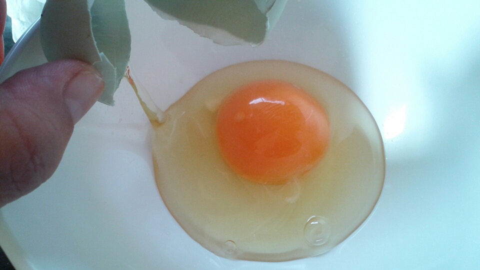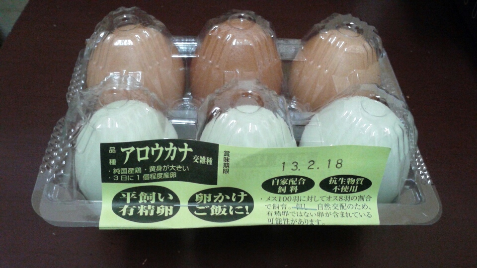 手前の卵、殻が青いでしょ? これは自然なもので、アロウカナという品種だからだそうです。