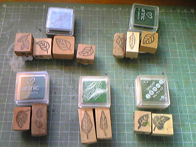 今回は5種類のインクパッドで、総勢13個の葉っぱはんこを押します。