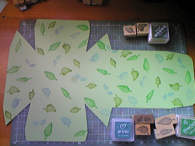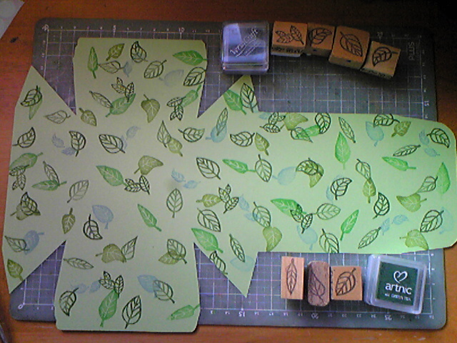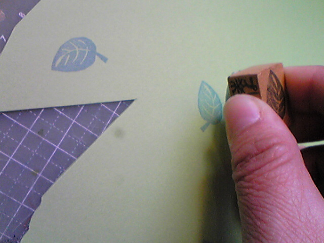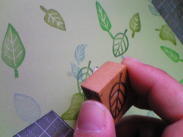 3色6種類の葉っぱがいい感じに散らばるように押します。あと、葉っぱの向きも、はんこの向きをくるくる変えて押してます。(向きを揃えて場所も決めて・・・という押し方も、整然としていてまた違った雰囲気になります。)
