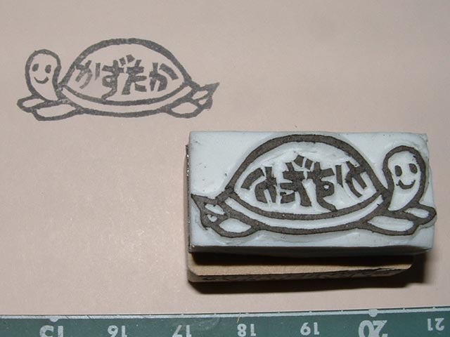 そうです、実はかめを飼っているんだそうです。そこで、かめをモチーフに、甲羅にひらがなで名前を入れるデザインにしました。今回名前フォントは特に指定無しだったので、わかりやすい字になるように彫りました。