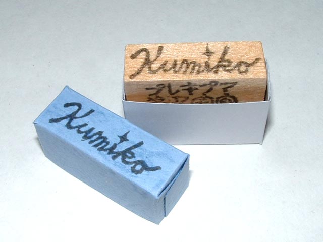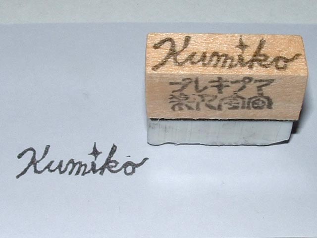 先月友人からお願いされたネームはんこです。「ローマ字で、ちょっとお洒落な感じで」と言われたら、私の中では筆記体です(笑)さらに「文字だけではなんなので、何かちょっと小さいイラストのようなものを…」ということだったので、「Kumiko」の「i」の点の部分を若干アレンジすることにしました。この程度であれば、文字のみ扱いで制作しますよ^^