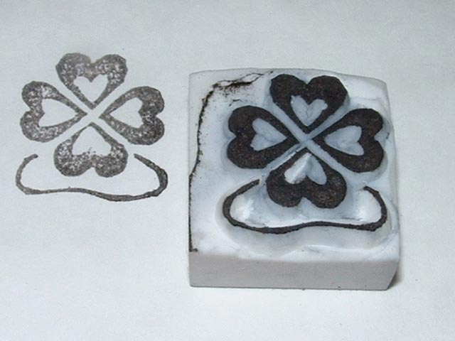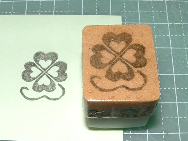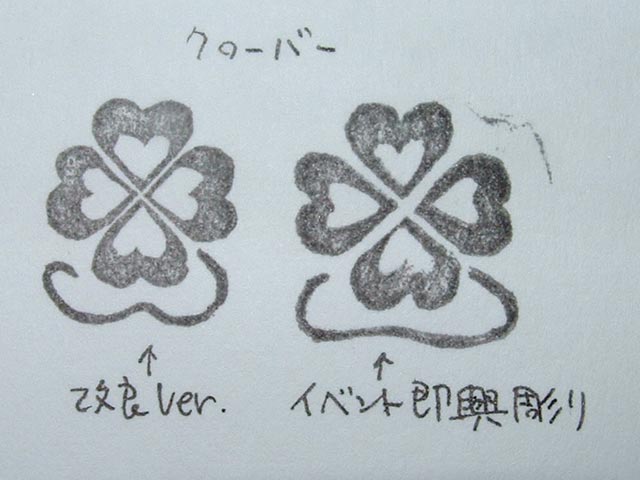 ところが、実演の初期(1日目の午前中だったと思う)に作ったクローバーはんこ、ものすごく問い合わせが多く…特に小学生〜中学生くらいの女の子が軒並み反応していたのが印象的。