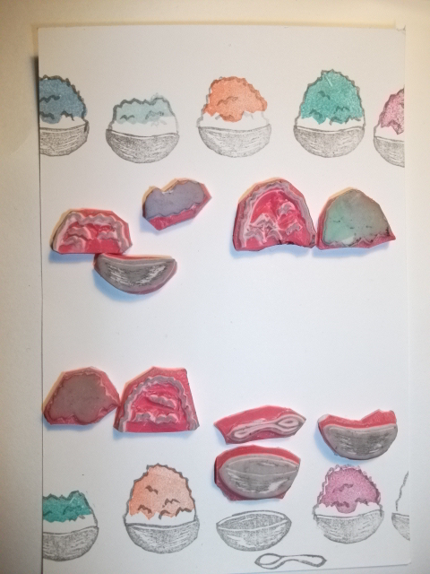 特に、このデザインの場合、お皿の版も2種類+空ver.、かき氷の部分のサイズも3種類…といろいろ組み合わせることによって1枚1枚がよりonly oneなポストカード(などの紙モノ雑貨)にはなるんだろうけど…