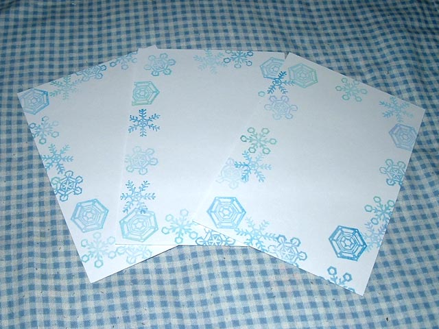 参考作品として紹介している雪の結晶はんこを使って作ったポストカードです。1枚1枚スタンプの押されている位置はランダムですが、ポストカードの四辺にスタンピングという点は変わりません。
