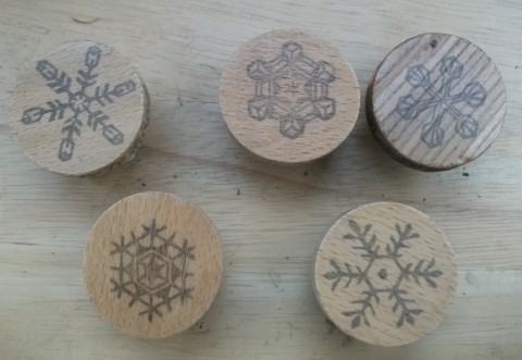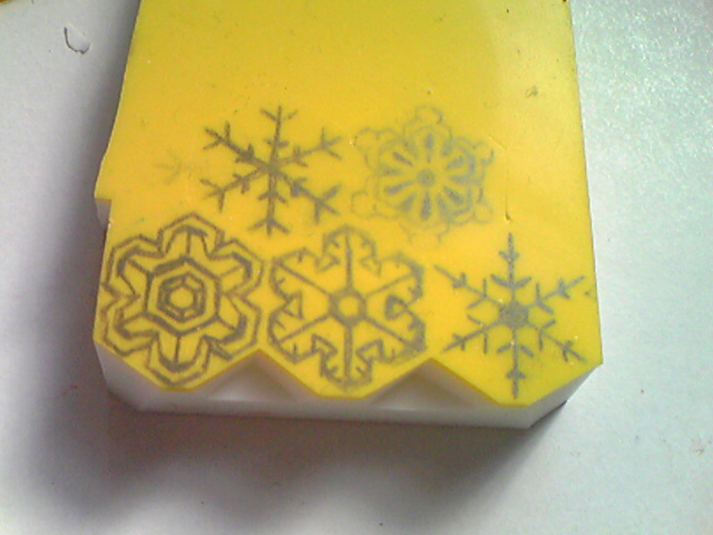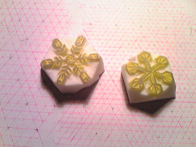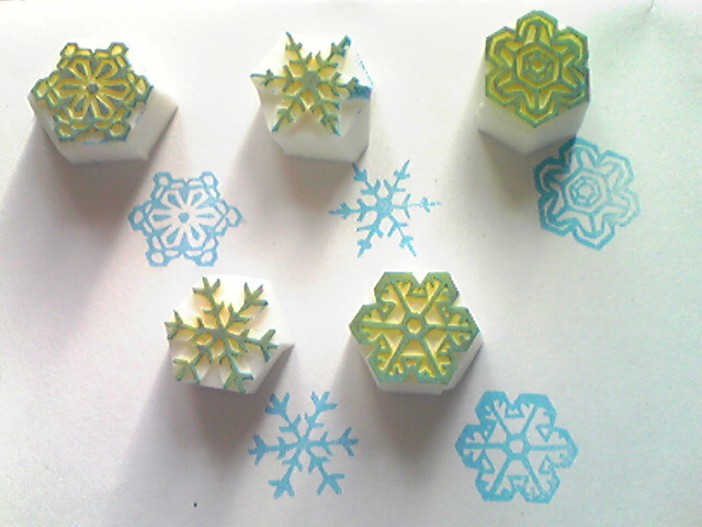 以前ポストカード用に作った雪の結晶はんこが幾つかあるのですが、「はんこの販売はしなのですか?」というリクエストがったので現在量産中です。量産、といっても、雪の結晶は実に様々な形があるのでいろんな形を数個づつのつもりで作っています。