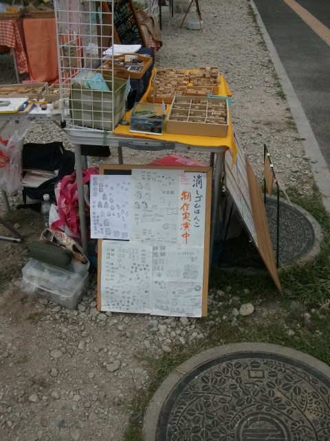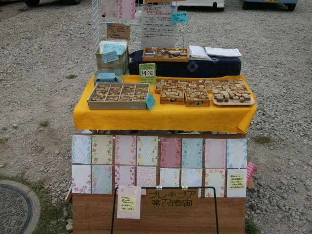 いつもは大小2つのキャンプ用テーブルを使い横に2つ並べてはんこなどを見せるようにしてるんです。