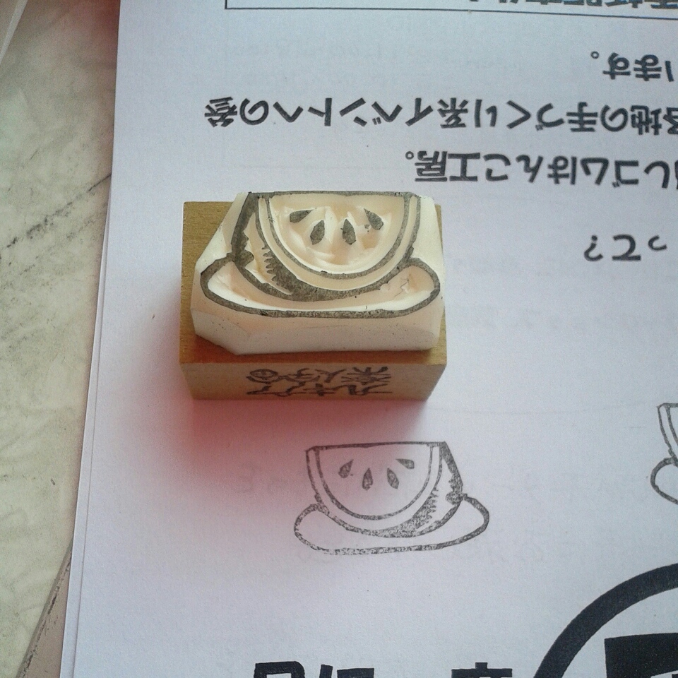 一応作例見本は置いているのですが、それ以上に消しゴムがどんどんはんこに変化していく過程の方が説得力があるのかなー、と。