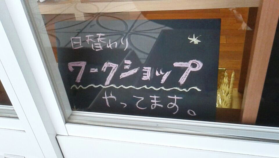 ワークショップ用のテーブルが、入って左手の壁際に移動され、壁沿いにあった棚(写真で写してるもの)が店の中央に。