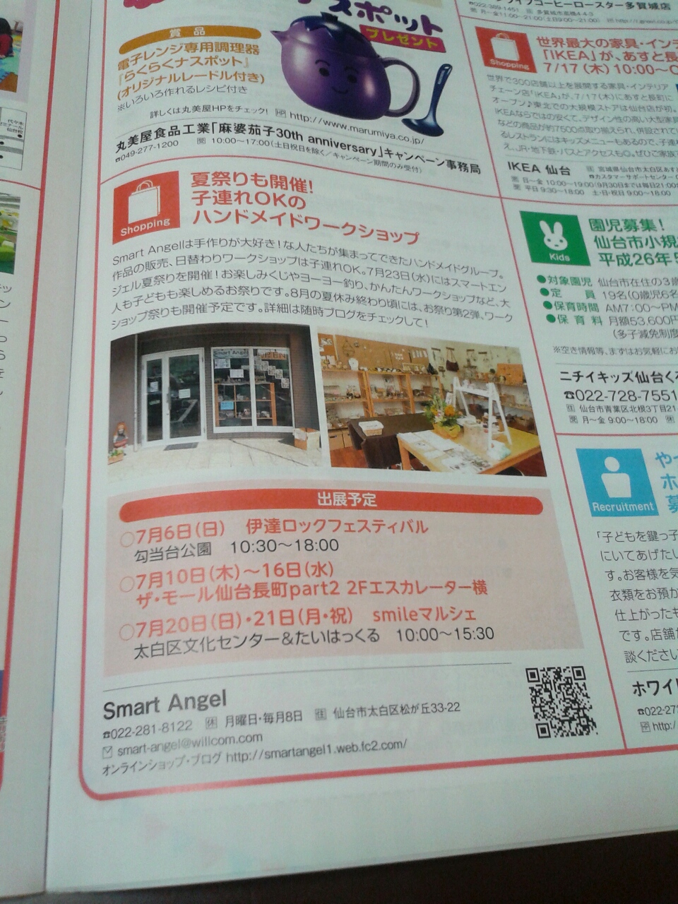 はんこを押すだけのワークショップは、8/18と8/22に八木山にある【Smart Angel】さんの店舗で行いますよ。