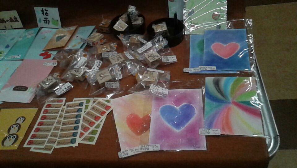 はんこ以外にはイラスト(パステル画・色鉛筆画中心)・切り絵などをブースに置いていることも。