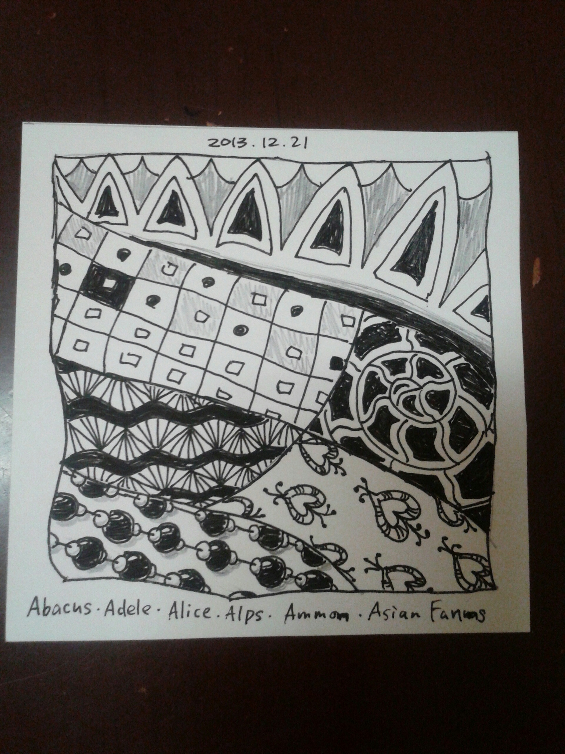 多くの場合、3.5インチ(約9センチ)角の白いタイルに描いていくのですが、上下もなく、どこにどの向きで、どのサイズでパターンを描いても構わないのです。